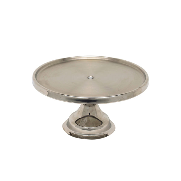 Professional stainless steel cake stand designed for coffee shops, bakeries, buffets, and hospitality display areas. With a wide 13 inch presentation surface, this stand is ideal for showcasing cakes, pastries, and desserts while elevating food for improved visibility and presentation.