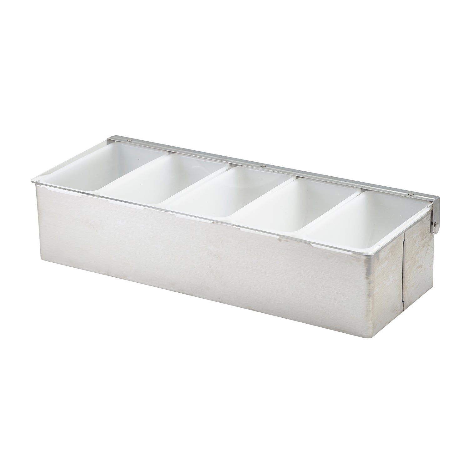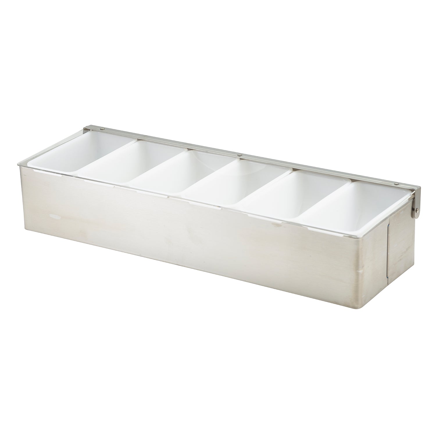 Keep your bar or prep area organized with this Stainless Steel Condiment Holder with Plastic Insert, available in multiple compartment options to suit your setup. Ideal for professional kitchens, bars, and catering stations, it provides a hygienic and convenient way to store and serve cocktail garnishes, condiments, and toppings. Each holder includes removable plastic inserts and a clear hinged lid for freshness and easy service.