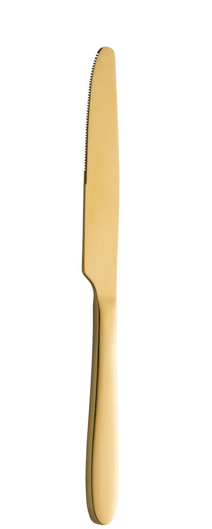 The Bullion table knife brings a sophisticated touch with its stunning gold finish and ergonomic design, crafted from durable 18/0 stainless steel and coated with PVD for long-lasting performance.