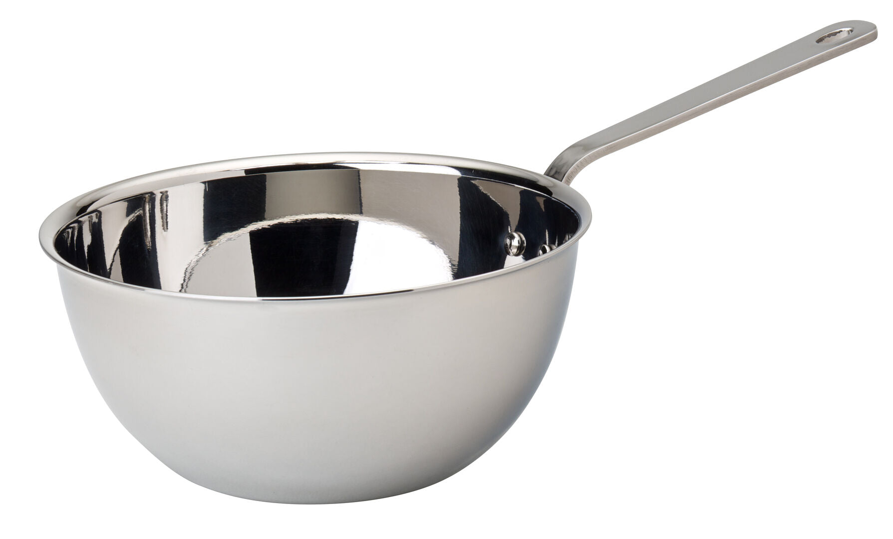 This mini stainless steel presentation wok offers a creative alternative to traditional bowls and plates, allowing chefs to elevate side servings and small dishes with a contemporary presentation style. Ideal for professional hospitality environments.