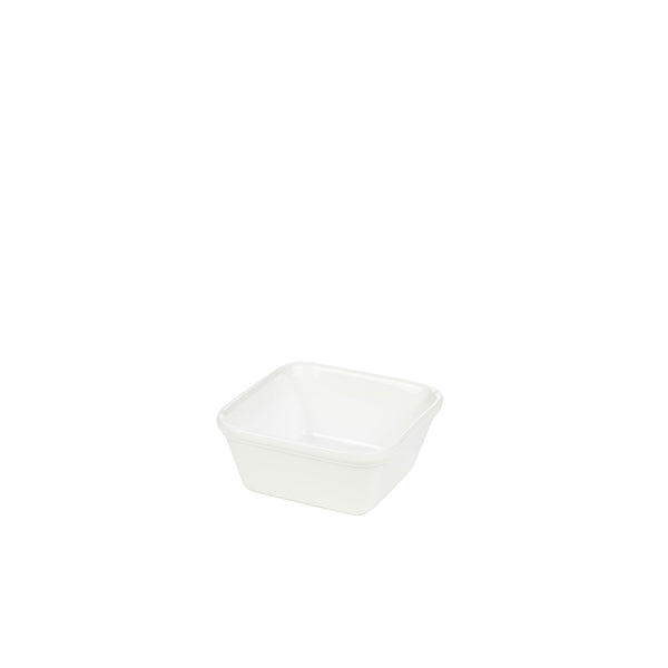 White porcelain square pie dish designed for professional catering, hospitality, and foodservice use. The compact square shape is ideal for individual pies, baked desserts, sides, and oven-to-table presentation with a clean, contemporary look.