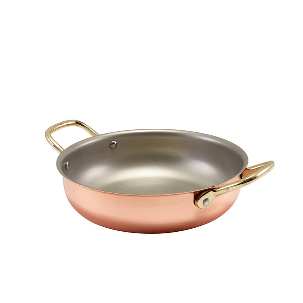 This premium round serving dish is crafted from durable stainless steel and finished with an elegant copper-plated exterior, offering a stylish and high-impact presentation for main dishes and shared platters. Designed for both casual and premium dining environments, the dish features attractive brass handles that provide a refined aesthetic and practical handling during service.